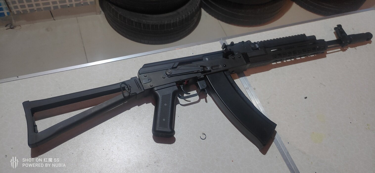 外管比较惊喜,应该是金属的,标尺比较粗糙,模没开好,标尺槽不是很清楚快慢机是金属的,弹匣没有快拆,底盖拆掉有个螺丝,卸掉之后就能把马达组拆出来,防尘盖尼龙的,质感凑活,拉机柄是尼龙的,是套在一个金属杆上的,后托金属的,链接插销孔是尼龙的,这不如rx,但是是老发射器了,这不计较,枪托可以折叠,但是有点问题,折叠回去后想要折叠开的话得用巧劲,要不然卡不住,折叠回来的卡扣是尼龙的,手拉可以拉机柄基本是全行程,通电后的行程折半,和斗趣的行程差不多,我觉得不错,aka的外管改装潜力挺大的,我打算今年入完越狱后把这一把的外观改出来,总之是挺满意的一次购物,这款发射器比较适合下场新手和改装新手,那简单测评就这样啦,希望能帮到你·