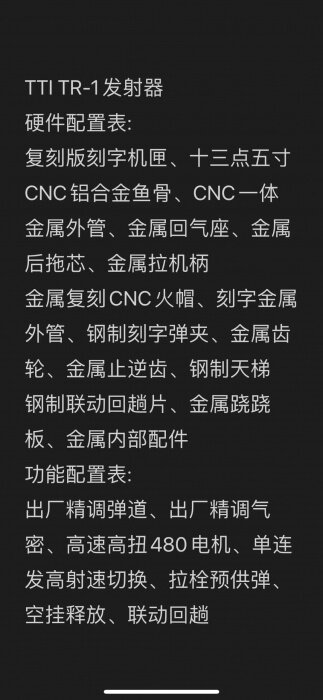 说的很高大上,不过这个价也差不多,什么机匣啊,复刻刻字不会是司马吧,包括那些说cnc的零件,市面上的这些产品也都是cnc的,其它说金属的不好说是锌还是铝,齿轮也没说明白是不是粉压,波箱也没说