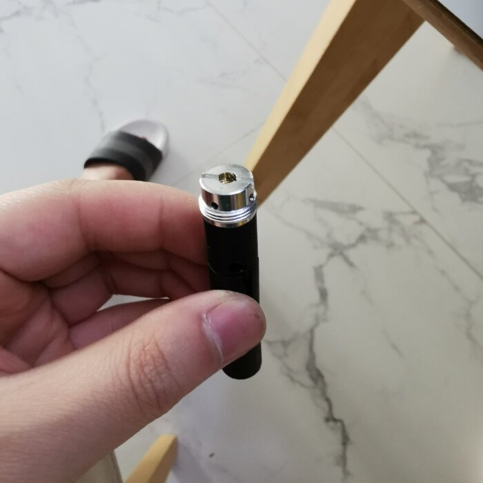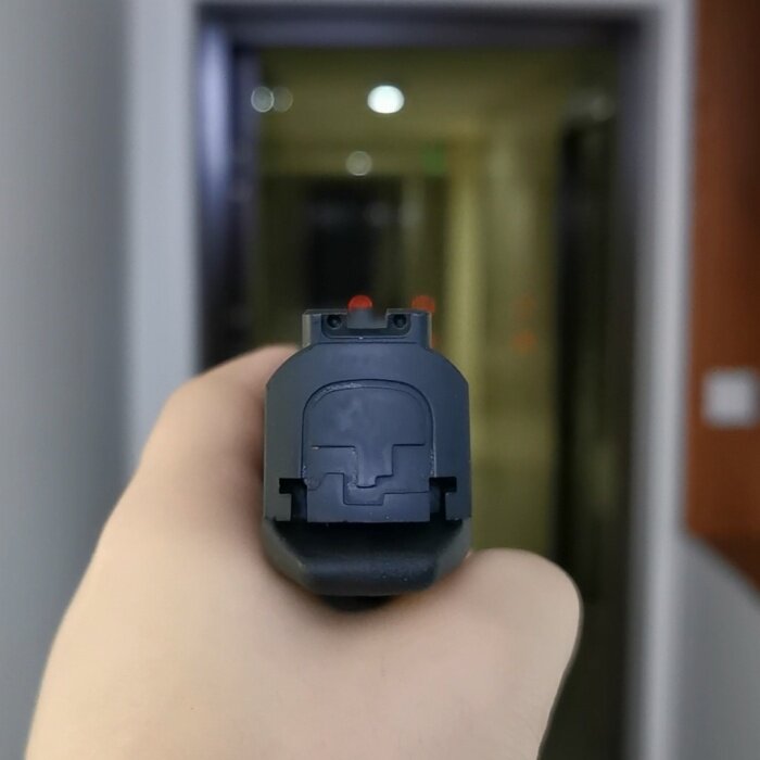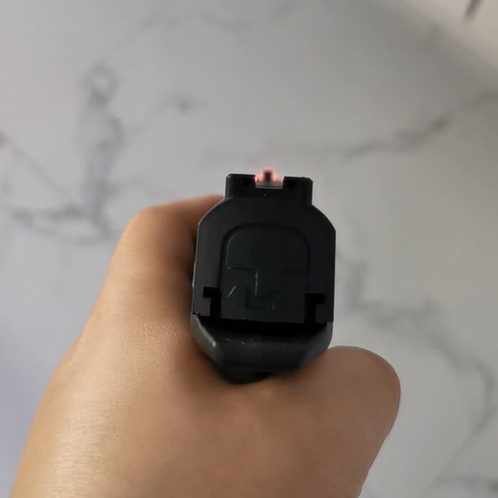 在校准激光时,先把增高触电片放进枪口底部,再旋转激光头进去,旋转到拧紧即可。此时的四个机米螺丝孔都是在外面的,把滑套后拉一点,让激光处于常亮状态,然后根据实际情况进行调节。调节完毕后取出增高垫片,再次将激光头复原,此时激光头已经和枪口齐平了,机密螺丝孔也藏在了里面